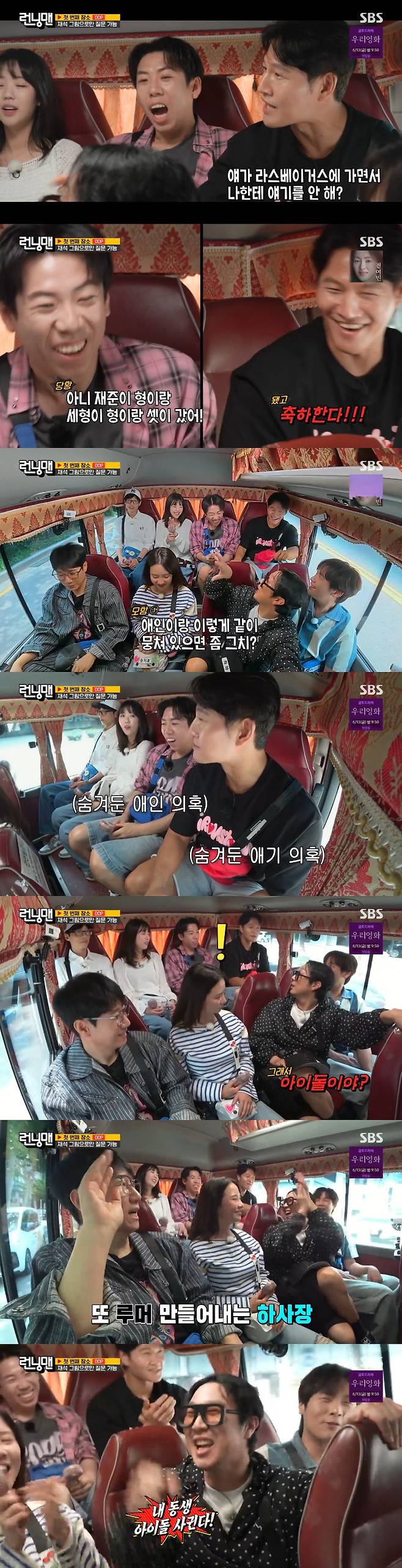 서운해하는 김종국에 양세찬은 괜히 신경 쓸까봐 이야기를 하지 않았다고 전했고, 하하는 "왜 여친 들킬까 봐 그런 거지?"라며 "아이돌이냐", "내 동생 아이돌 사귄다"며 실시간으로 루머를 생산해 웃음을 자아냈다.