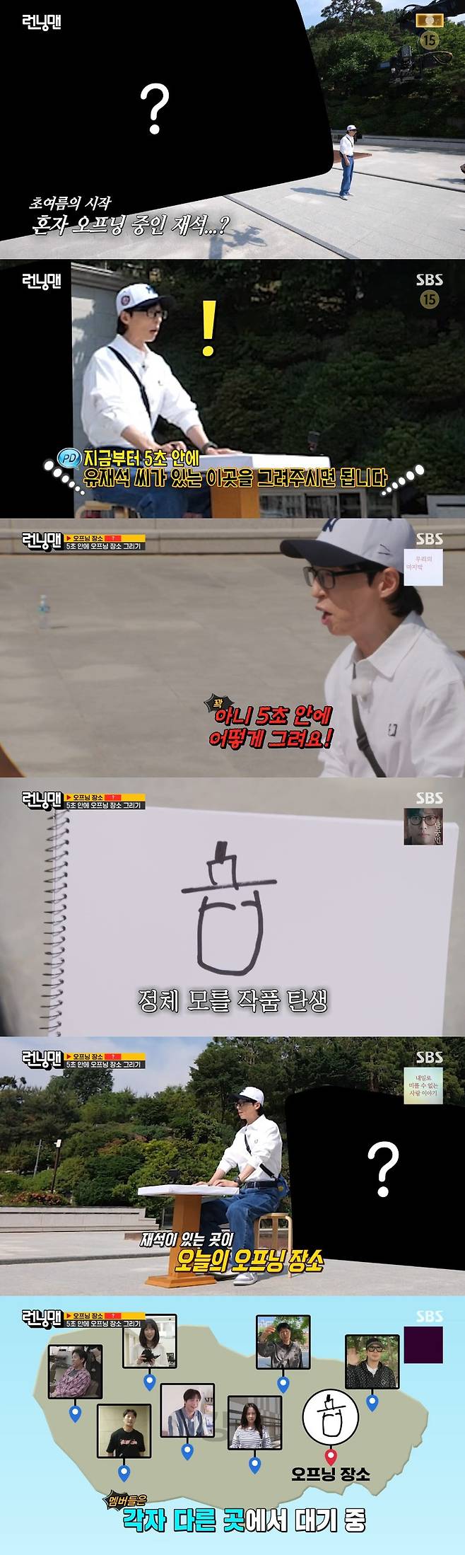 한편, 이날 오프닝부터 홀로 등장한 유재석은 제작진이 스케치북과 펜을 건넨 뒤 5초 안에 오프닝 장소를 그릴 것을 요청하자 당황하며 서둘러 그림을 그렸다.