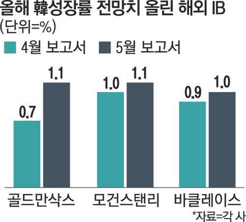 글로벌 투자은행(IB)들이 0%대로 낮췄던 한국의 올해 경제성장률 전망치를 속속 상향 조정하고 있다.