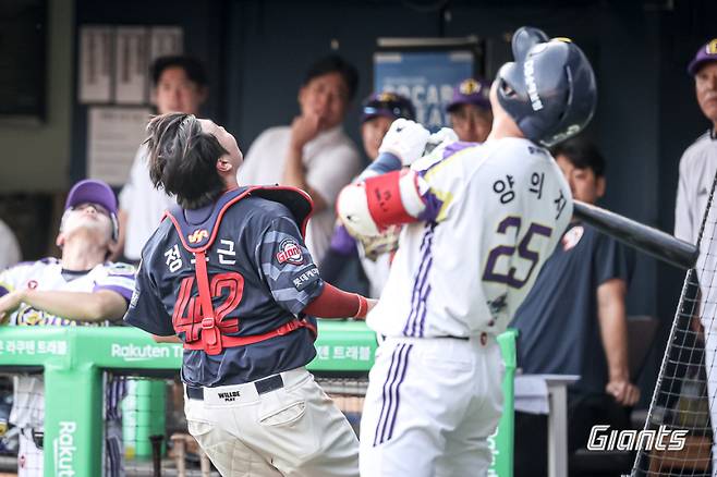 이때 우익수였던 김동혁이 몸을 날려 포구에 성공했다. 시선은 공에 둔 채 몸을 진행 방향으로 날렸다. 마치 뒤로 뛰는 것 같은 모습으로 공을 잡아냈다. 1루 주자였던 김민석은 황급히 1루로 귀루 해야 했다. 안타를 확신할 수밖에 없는 타구였기에 리터치는 선택지로 두지 않았던 모양새다. 김원중은 이후 대타 류현준을 3루 땅볼, 후속 이유찬을 투수 앞 땅볼로 돌려세우며 이닝을 마무리했다.