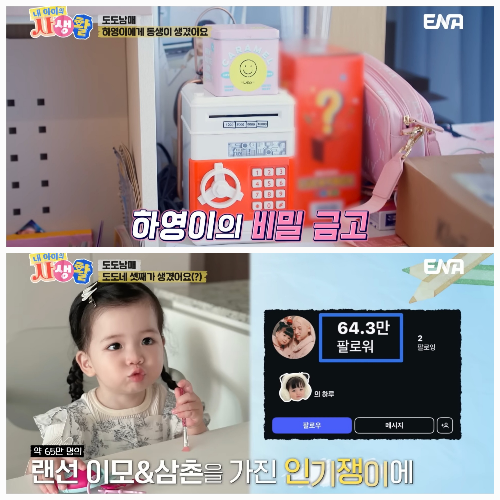 8일 방송된 ENA 예능 프로그램 ‘내 아이의 사생활’에서는 SNS 스타 이로가 도도 남매의 집을 방문하며 벌어진 에피소드가 담겼다. 팔로워 65만 명, 누적 조회수 1억 뷰를 자랑하는 ‘핫한’ 아기 이로의 등장에 하영이는 설렘을 감추지 못했다. 장윤정은 “하영이가 항상 여동생 갖고 싶다고 말한다”며 미소 지었다.
