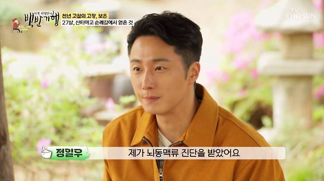 정일우는 27살에 뇌동맥류 진단을 받고 죽음의 공포와 마주했던 경험을 이야기했다. 정일우는 "제가 산티아고를 3번 다녀왔다. 20대 때 한창 일하던 시기에 뇌동맥류 진단을 받았다. 눈앞이 깜깜해지더라. '내일 어떻게 될지 모르는데 일단 한 번 가보자' 생각했다"고 성지순례를 가게 된 계기를 밝혔다.