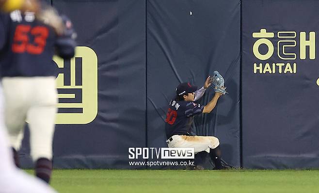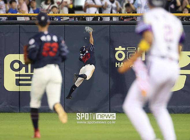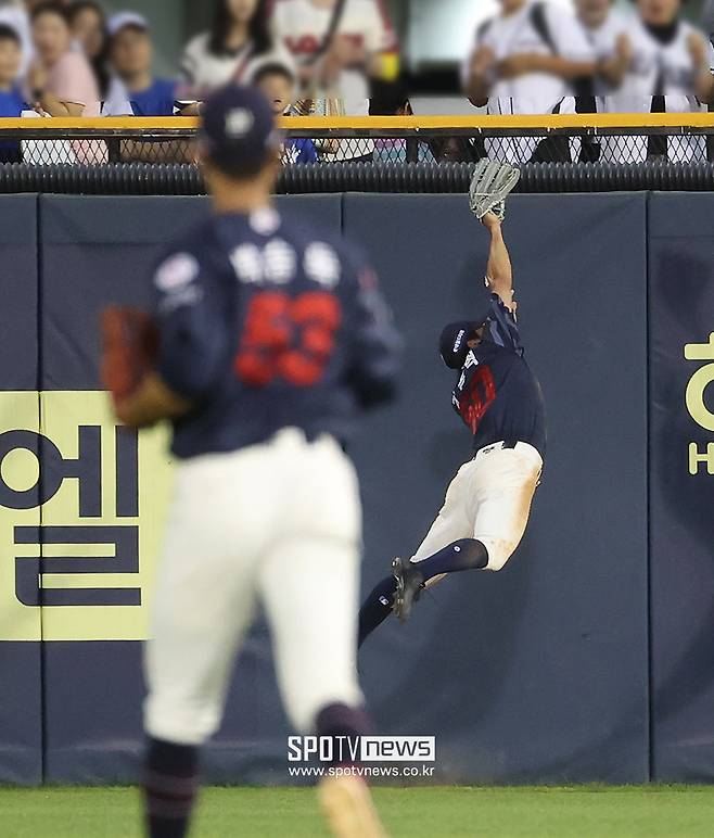 머리 위로 넘어가는 타구였지만, 롯데 우익수 김동혁은 펜스도 의식하지 않고 슈퍼맨처럼 전력 질주해 끝내 잡아내는 놀라운 수비를 선보였다.