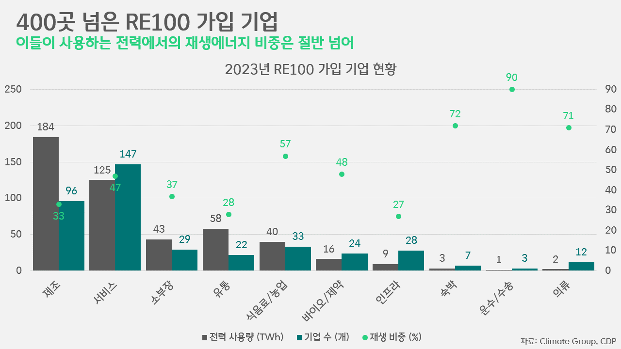 RE100 가입 기업 중 가장 큰 비중을 차지하는 업종은 서비스업(143개 기업)입니다. 그러나 가입기업 수 2위 업종인 제조업(109개 기업)의 경우, 사용하는 전력량 자체가 222TWh에 달해 서비스업 가입기업 전체 전력 사용량(138TWh)의 1.6배에 달하죠. 두 업종 사이 재생에너지 이용 비중은 서비스업 평균 45%, 제조업 평균 42%로 예상 외로 큰 차이를 보이지 않았습니다. 에너지전환을 이야기할 때마다 나오는 '제조업 중심인 우리나라는 힘들다', 그래서 '우리나라에서 RE100은 쉽지 않다'는 반대 논리가 무색해지는 숫자입니다.