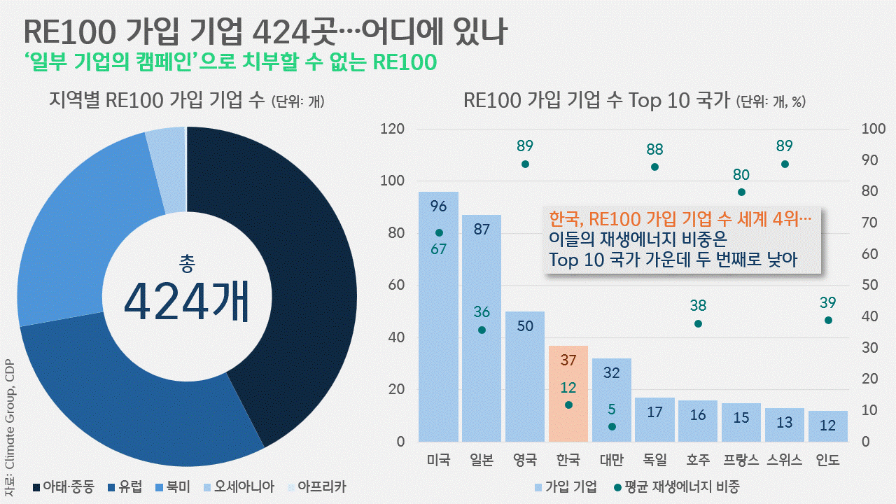이런 가운데, 한국은 이번에도 전 세계에서 'RE100 이행이 가장 어려운 국가'로 꼽혔습니다. RE100 가입 기업들을 대상으로 조사를 한 결과, 70개 기업이 한국을 꼽은 겁니다. 한국보다 기업들의 재생에너지 이용 비중이 낮은 대만과 싱가포르보다도 한국의 문제를 지적한 기업이 더 많았습니다.