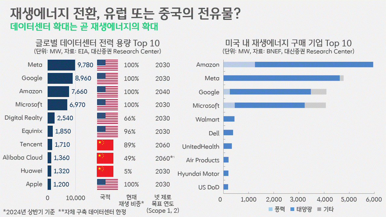 여야 가릴 것 없이, 모두가 AI와 데이터센터를 한국의 '핵심 미래 먹거리'로 꼽고 있습니다. 하지만 이 먹거리를 차리기 위한 '기본 재료'가 재생에너지라는 사실을 아직도 인식 못 하는 경우도 여전히 많습니다. 미국의 EIA(Energy Information Administration, 에너지정보청) 집계에 따르면, 전 세계에서 가장 '열일'하는 데이터센터 10곳 중 7곳은 미국 기업의 데이터센터입니다. 이중 Top 4에 해당하는 메타, 구글, 아마존, 마이크로소프트 외에도 Top 10 가운데 10위에 있으나 일반 소비자에겐 상당한 존재감을 뽐내는 애플 또한 이미 사용 전력 전량을 재생에너지로 조달하고 있습니다.