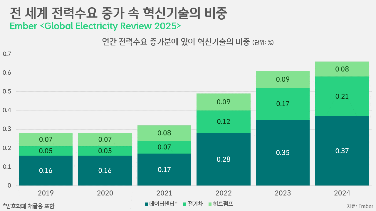 Ember는 우선, 그렇지 않아도 갈수록 늘어나는 전력수요에 혁신기술이 이러한 증가세에 힘을 더하는 데에 주목했습니다. 데이터센터와 전기차, 히트펌프가 바로 그것입니다. 2020년까지만 하더라도, 증가분에서 이들이 차지하는 비중은 0.3%가 채 되지 않았습니다. 하지만 2024년 기준, 데이터센터의 비중은 2020년 0.16%에서 0.37%로 배 이상, 전기차는 0.05%에서 0.21%로 4배 이상이 됐죠. 히트펌프의 경우, 지난해 증가분에서의 비중은 0.08%로 2020년(0.07%)과 비슷했지만, 증가폭 자체가 커진 만큼, 실질적인 전력수요는 늘어났습니다.