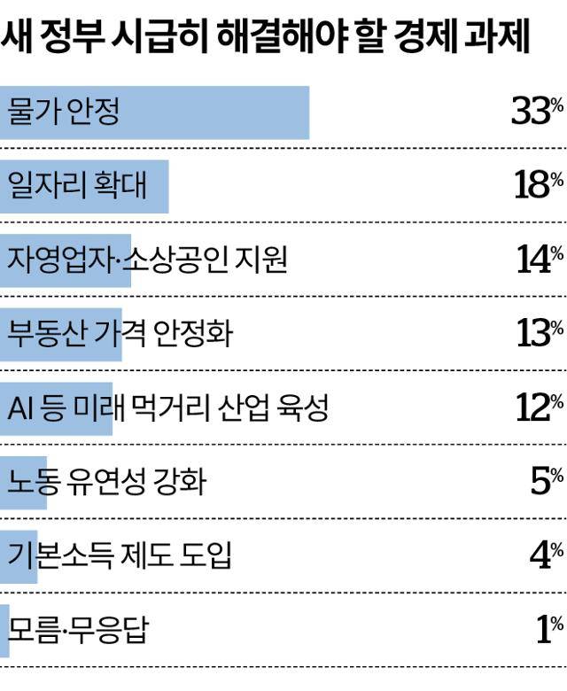 이 대통령이 가장 먼저 해결해야 할 경제분야 과제로는 응답자 세 명 가운데 한 명이 ‘물가안정'(33%)을 꼽았다. 통계청이 최근 발표한 ‘2025년 5월 소비자물가 동향’에서 지난달 가공식품 물가의 전달 대비 상승률은 4.1%로 12·3 계엄 사태 이전인 지난해 11월 1.3%의 세 배를 웃돌았다. 윤석열 정부가 출범했던 2022년 5월과 비교하면 가공식품 74개 품목 중 71개가 올랐고, 같은 기간 두 자릿수 상승률을 기록한 가공식품은 3분의 2인 50개에 달한 것으로 나타났다. 소비자의 체감 물가가 확 뛴 셈이다. 뒤이어 일자리 확대(18%), 자영업자 및 소상공인 지원(14%) 부동산 가격 안정화(13%) 순이었다.