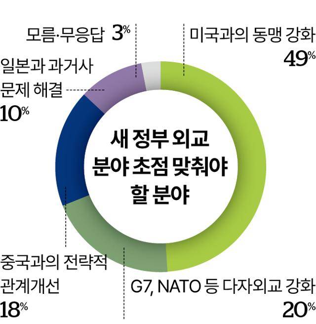 새 정부의 외교 전략과 관련, 응답자의 절반 가까이가 한미동맹 강화가 필요하다(49%)고 답했다. 트럼프 정부 들어 불확실성이 커진 국면을 안정적으로 풀어가길 기대하는 견해가 다수 반영된 것으로 보인다. 이어 이 대통령이 15일 참석할 주요7개국(G7) 정상회의를 비롯해 북대서양조약기구(NATO·나토) 정상회의를 포함한 다자 외교 강화(20%), 중국과의 전략적 개선(18%) 관계 개선 필요성 순으로 나타났다. 일본과의 과거사 문제 해결이 우선이라는 응답은 10%에 그쳤다.