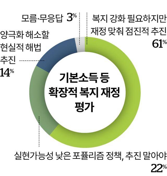 이 대통령이 후보 시절 강조한 기본소득을 비롯해 확장적 복지 정책에 대해선 ‘복지 강화는 필요하지만 재정 여건에 맞춰 점진적으로 추진해야 한다’(61%)는 응답이 절반을 넘었다. 바로 추진해야 한다(14%)거나 추진하지 말아야 한다(22%)는 응답에 비해 압도적으로 많았다. 아직 국민적 공감대가 형성되지 않은 셈이다. 따라서 일방적으로 밀어붙이기 보다는 충분한 사회적 논의를 거쳐 신중하게 접근해야 한다는 쪽으로 여론이 기울었다고 볼 수 있다.