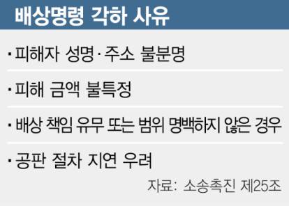 법원의 배상명령 각하 사유는 주로 피해자 성명·주소가 분명하지 않거나, 피해 금액이 특정되지 않은 경우다. 또 피고인의 배상 책임의 유무 또는 그 범위가 명백하지 않은 때도 포함된다. 배상명령으로 인해 공판 절차가 현저히 지연될 우려가 있거나 형사소송 절차에서 배상명령을 하는 게 타당하지 않는다고 인정되는 경우도 각하 사유다.