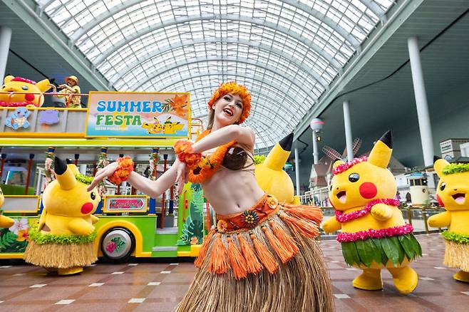 '포켓몬 월드 어드벤처: 썸머 페스타'는 여름 방학을 맞이해 훌라 댄스 피카츄와 함께 트로피컬 아일랜드로 여행을 떠나는 콘셉트로 오는 8월 31일까지 열린다. (사진=롯데월드 어드벤처 제공) 2025.06.09. photo@newsis.com *재판매 및 DB 금지