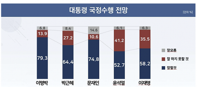 역대 대통령들의 국정 수행 전망과 비교하면 윤석열 전 대통령(52.7%)보다는 높지만 이명박(79.3%), 박근혜(64.4%), 문재인(74.8%)보다는 낮았다.