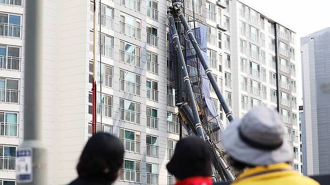 피해 아파트 건너편에 거주 중인 허 씨는 "전날 밤 집에 있다가 갑자기 무언가 깨지고 떨어지는 소리가 나길래 급하게 밖으로 나갔는데 이미 천공기가 넘어져 있었다"며 "당시 근처에 사는 주민 수백 명이 뛰어나왔을 정도로 소리가 컸다"고 했습니다.