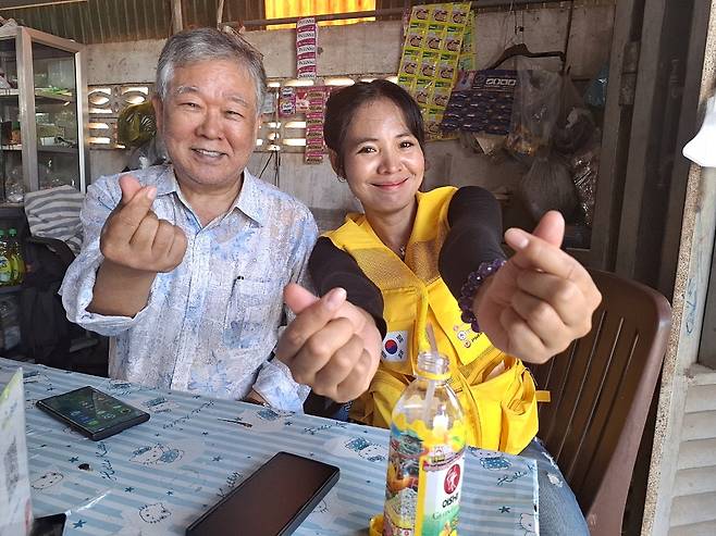 | ▲ 의료봉사차 캄보디아를 방문한 캄보디아 당구여제 스롱 피아비 선수가 대한노인회 캄보디아지회 윤신웅 회장과 기념촬영을 하고 있다. |