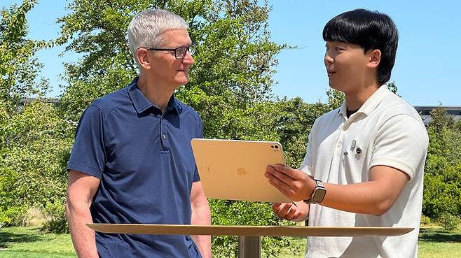 ▲ 8일(현지시간) 오전 미 캘리포니아주 쿠퍼티노 애플 본사에서 대학생 앱 개발자 한가온(24) 씨가 팀 쿡 최고경영자(CEO)에게 자신이 개발한 앱을 소개하고 있고 있다.