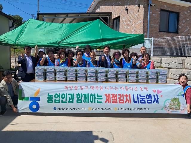 NH농협 충북 진천군지부(지부장 유호종)가 5일 진천읍 민호농장에서 ‘농업인과 함께하는 계절 김치 나눔 행사’를 개최했다(사진).