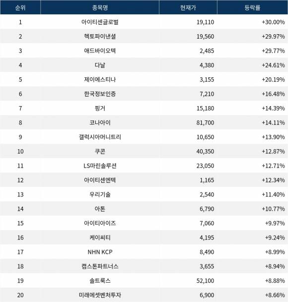 이밖에도 LS마린솔루션(060370) ▲12.71%, 아이티센엔텍(010280) ▲12.34%, 우리기술(032820) ▲11.40%, 아톤(158430) ▲10.77%, 아이티아이즈(372800) ▲9.97%, 케이씨티(089150) ▲9.24%, NHN KCP(060250) ▲8.99%, 캡스톤파트너스(452300) ▲8.94%, 솔트룩스(304100) ▲8.88%, 미래에셋벤처투자(100790) ▲8.66% 등을 기록하며 시장에서 활발히 거래되고 있다.