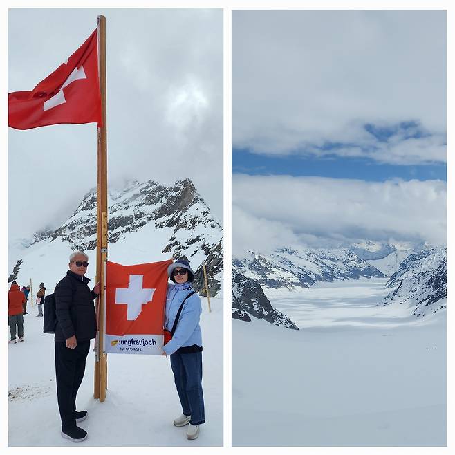 | ▲ 스위스 융프라우 융프라우 만년설 전망대에서 찍은 인증숏과 스핑 전망대에서 촬영한 알레취 빙하 |