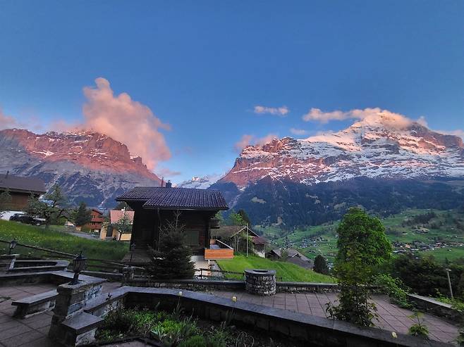 | ▲ 그린델발트에서 촬영한 저녁 융프라우 스위스는 해가 9시가 넘어야 지기에 저녁에 멀리 보이는 융프라우가 환상적이었다. |