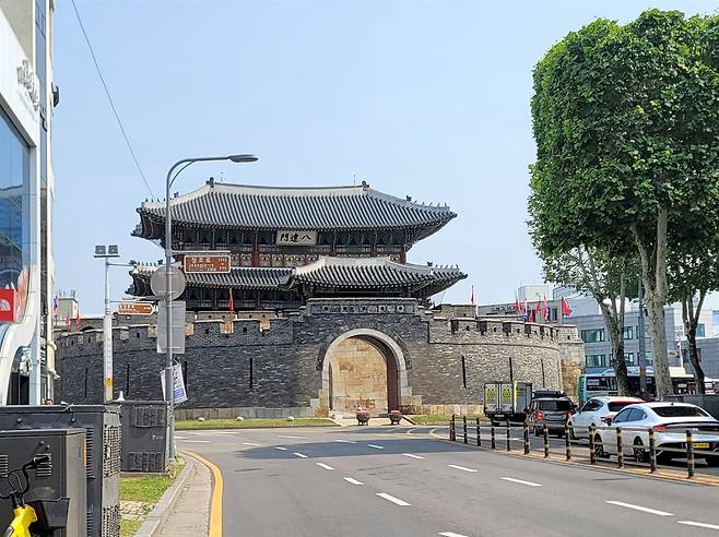 아름다운 경치에 취해 걷다 보니 어느새 시간이 훌쩍 흘렀다. 걸음을 재촉하여 팔달문에 도착했다. 팔달문은 수원 화성의 남문으로, 정조는 '산 이름이 팔달이어서 팔달이며, 사방팔방에서 배와 수레가 모인다'는 뜻으로 풀이했다고 한다.