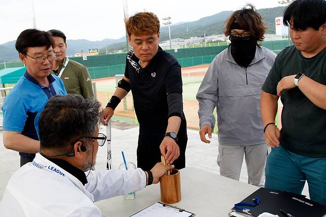 <사진. 대진 추첨을 하고 있는 칠곡군 T7 리그 팀 대표자>
