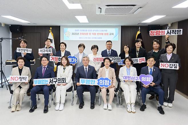 대전 서구의회는 지난 5일 의회 간담회장에서 서구의회 의원과 직원 50여 명이 참석한 가운데 전체 의원과 직원을 대상으로 공직자의 윤리의식을 높이고 청렴한 의정활동과 공정한 조직문화를 조성하기 위해 '반부패·청렴 교육'을 실시했다.