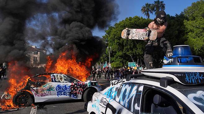 시위대 일부는 LA 현지의 자율 주행 자동차 '웨이모'를 부수고 불을 지르기도 했습니다.