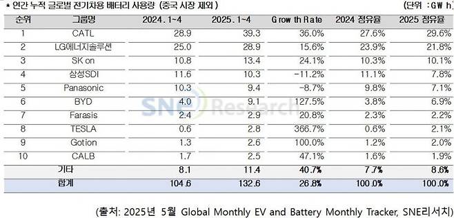 올해 1월부터 4월까지 중국을 제외한 전 세계 전기차 배터리 시장은 전년 동기 대비 26.8% 성장한 것으로 나타났다. 중국 기업들의 점유율이 확대하고 있는 것과 달리 국내 배터리 3사의 점유율은 1년 새 5%가 넘게 빠졌다.