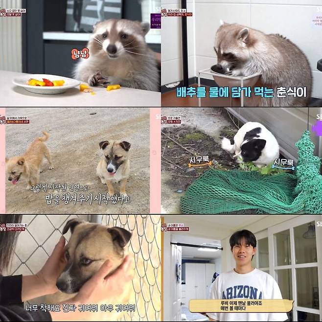 첫 번째 주인공은 등장부터 눈길을 사로잡았다. 올해로 라쿤 인생 3년 차를 맞은 '춘식이'는 사람 아기와 고양이와 함께 한 집에서 살아가는 말썽꾸러기 가족 구성원이다. 손을 자유자재로 쓰는 라쿤 특유의 능력을 장착한 춘식이는 냉장고 문을 열고, 장롱을 뒤지고, 심지어 화장실 문까지 따고 들어가 변기에 손을 씻는 등 하루도 조용할 틈이 없다. 먹는 걸 좋아하는 데다 활동량도 왕성해 몸무게는 어느새 20kg을 훌쩍 넘었다. 커피를 엎지르고 집안을 뒤엎는 사고뭉치지만, 그런 춘식이에게 생일까지 챙겨주는 가족들의 따뜻한 모습은 시청자들의 마음을 사로잡았다. MC들은 "소동이 곧 일상이고, 사고가 곧 행복인 가족"이라며 웃음을 지었다.