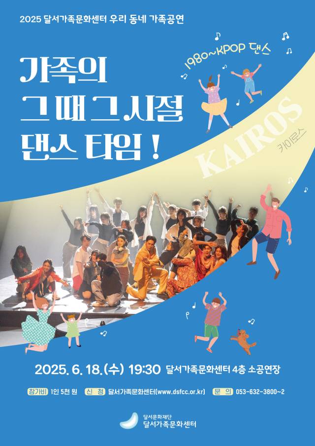 달서가족문화센터에서 오는 18일(수) 오후 7시 30분에 4층 소공연장에서 '우리 동네 가족공연: 가족의 그 때 그 시절, 댄스 타임'을 개최한다.