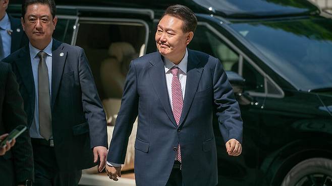 ▲ 윤석열 전 대통령이 9일 서울 서초구 서울중앙지방법원에서 열린 내란 우두머리 혐의·직권남용 권리행사 방해 혐의 사건 6차 공판에 출석하고 있다.
