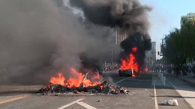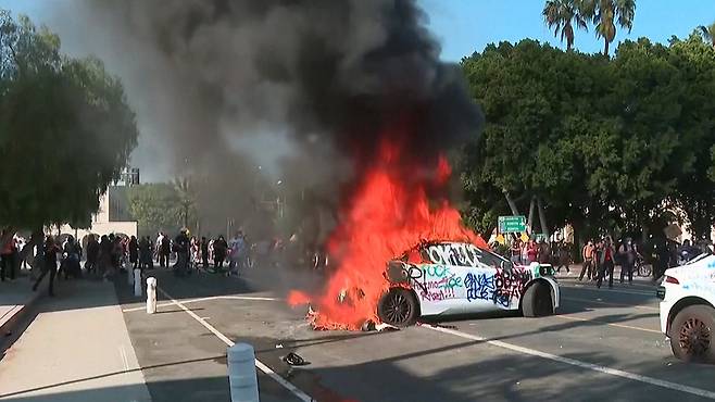 시위대 일부는 LA 현지의 자율 주행 자동차 '웨이모'를 부수고 불을 지르기도 했습니다.