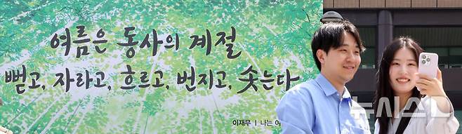 [서울=뉴시스] 김선웅 기자 = 9일 서울 종로구 교보생명 빌딩 외벽 광화문글판에 이재무 시인의 시 '나는 여름이 좋다'에서 발췌한 여름편이 게시돼있다. 2025.06.09. mangusta@newsis.com