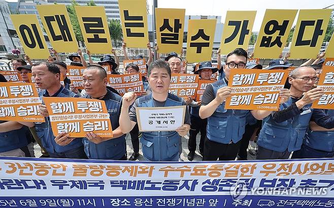 (서울=연합뉴스) 임화영 기자 = 택배노조 조합원들이 9일 서울 용산 대통령실 인근에서 열린 우체국 택배노동자 생존권 보장 촉구 기자회견에서 물량통제 및 수수료 동결을 규탄하고 있다. 2025.6.9