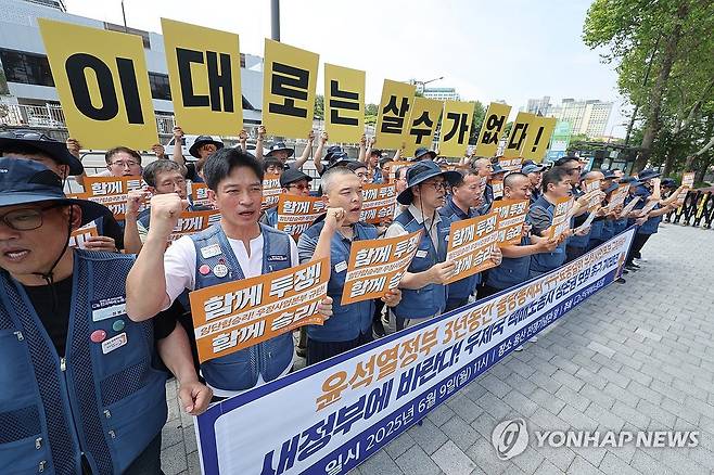(서울=연합뉴스) 임화영 기자 = 택배노조 조합원들이 9일 서울 용산 대통령실 인근에서 열린 우체국 택배노동자 생존권 보장 촉구 기자회견에서 물량통제 및 수수료 동결을 규탄하고 있다. 2025.6.9