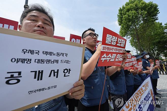 (서울=연합뉴스) 임화영 기자 = 택배노조 조합원들이 9일 서울 용산 대통령실 인근에서 열린 우체국 택배노동자 생존권 보장 촉구 기자회견에서 물량통제 및 수수료 동결을 규탄하고 있다. 2025.6.9
