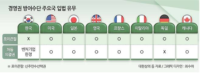 ▶경영권 방어 수단 전무=포이즌필과 차등의결권(주식 종류에 따라 의결권 수를 다르게 정하는 제도)은 대표적인 경영권 방어 수단으로 꼽히고 있다. G7 국가인 미국과 일본, 영국, 프랑스, 이탈리아, 캐나다는 포이즌필과 차등의결권을 모두 보장하고 있다. 독일은 포이즌필만 시행하고 있다.