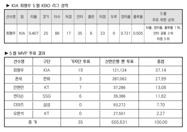 5월 MVP로 선정된 최형우에게는 상금 300만 원과 트로피가 전달될 예정이다. 또한 유소년 야구 발전을 위해 신한은행의 후원을 통해 전주고등학교에 200만 원의 기부금을 전달한다.