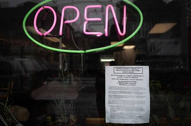 [1월 22일 시카고 인근 지역의 한 가게. 대규모 추방에 반대하는 시위에 동참할 것을 촉구하는 전단이 유리에 붙어 있다. (AFP=연합뉴스 자료사진)]