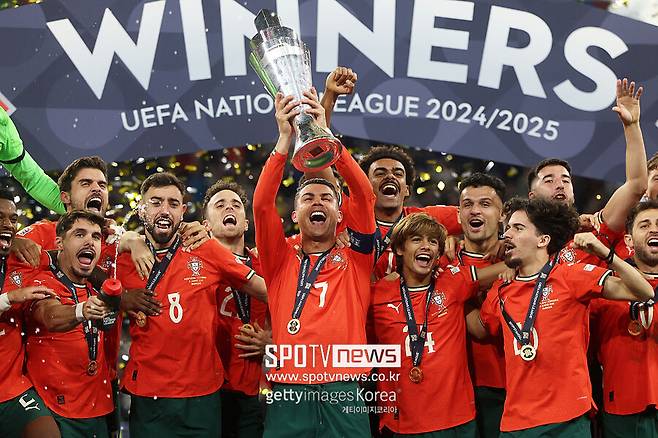 포르투갈은 9일(한국시간) 독일 뮌헨의 알리안츠 아레나에서 열린 2024-2025 유럽축구연맹(UEFA) 네이션스리그(UNL) 스페인과 결승전에서 정규시간과 연장전을 2-2로 비긴 뒤 승부차기에서 5-3으로 이겨 트로피를 들어 올렸다.