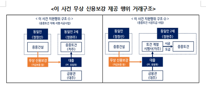 이런 상황에서 중흥건설은 2015년 7월부터 2025년 2월까지 10년간 중흥토건 및 6개 계열회사가 시행하고 중흥토건이 단독 시공하는 12개 주택건설 및 일반산업단지 개발사업 관련 24건의 PF 또는 유동화 대출이 실행될 수 있도록 총 3조 2천96억원 규모의 무상 신용보강을 제공했습니다.