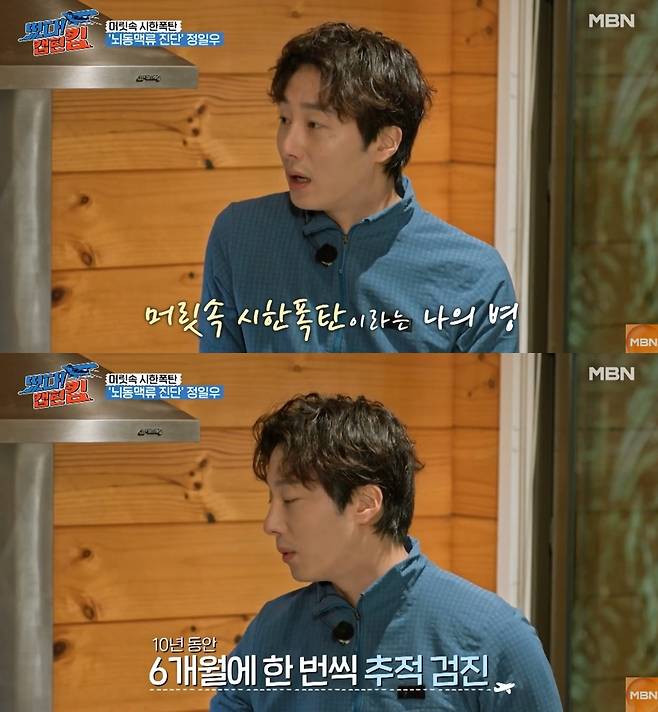 27살에 뇌동맥류 진단을 받아 큰 화제와 걱정을 받았던 정일우는 "20대 때 한창 일하다가 뇌동맥류 진단을 받았다. 눈앞이 깜깜해지더라"라고 운을 뗐다.