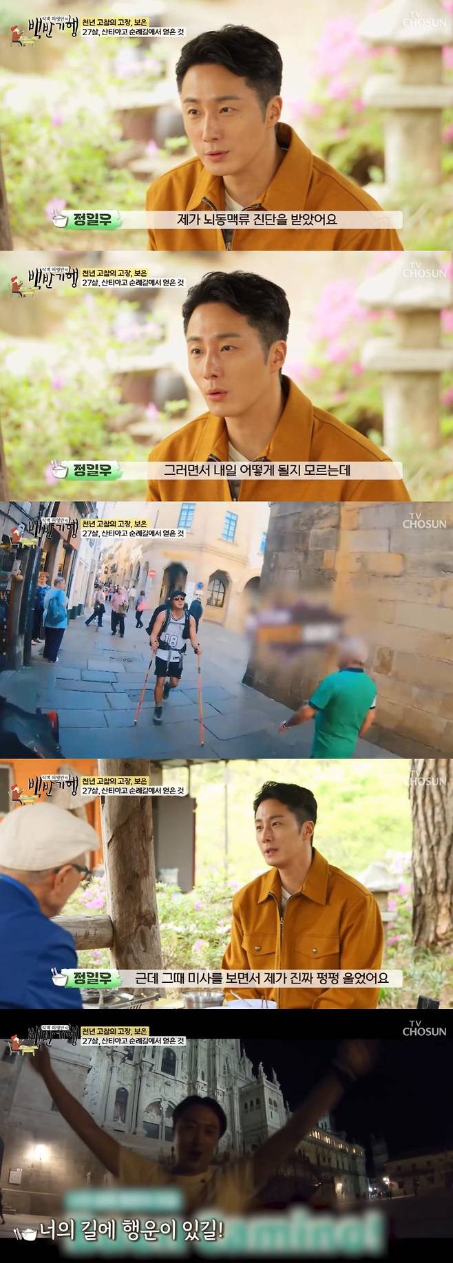 정일우는 "산티아고 대성당에서 일요일마다 순례자를 위한 미사를 한다. 그때 미사를 보면서 펑펑 울었다. 대성통곡을 했다. 순례길에서 만난 외국 친구들이 '너 괜찮냐'고 '왜 그렇게 우냐'고 했다. 그렇게 울고 나니까 마음이 차분해지면서 뭔가 딱 정리가 되더라"라며 오히려 뇌동맥류 진단 후 더욱 인생을 즐기고 감사함을 느끼며 산다고 전했다.