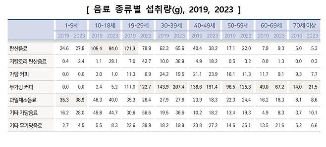 성인의 경우 무가당 커피와 저칼로리 탄산음료 섭취가 크게 증가한 반면, 19-39세 청년층은 무가당 커피와 더불어 여전히 당이 포함된 탄산음료도 많이 섭취하는 것으로 나타났다.