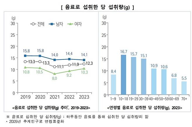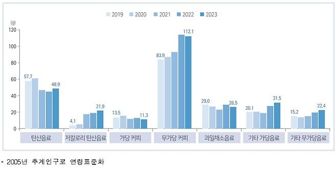 이처럼 음료 섭취량의 증가 추세와는 달리 '음료로 섭취한 당 섭취량'은 다소 감소(약 1.0g)했다.