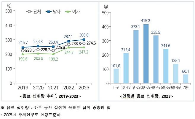 가장 음료를 많이 마시는 연령은 ▲30대 415.3g으로 하루 평균 2잔 이상(200ml 기준)을 마시고 있었고, 그 다음은 ▲20대와 40대가 하루 평균 1.5잔 이상의 음료를 마시는 것으로 조사됐다.