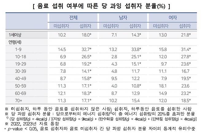 그러면서 "성인의 저칼로리, 저당 음료 섭취 증가 등 음료 섭취 양상의 변화는 에너지와 당 섭취량 감소 측면에서는 긍정적일 수 있으나, 20, 30대는 여전히 탄산음료를 많이 마시고 있어 수분 섭취를 위해 음료 대신 물을 충분히 마실 것을 권고한다"고 강조했다.