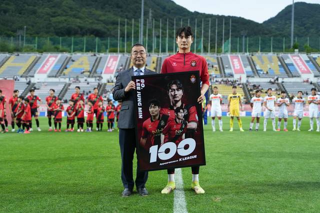 경남은 6월 7일(토), 창원축구센터에서 열린 화성FC와의 홈경기에서 이중민의 리그 100경기 출전 달성을 기념하는 행사를 가졌다.