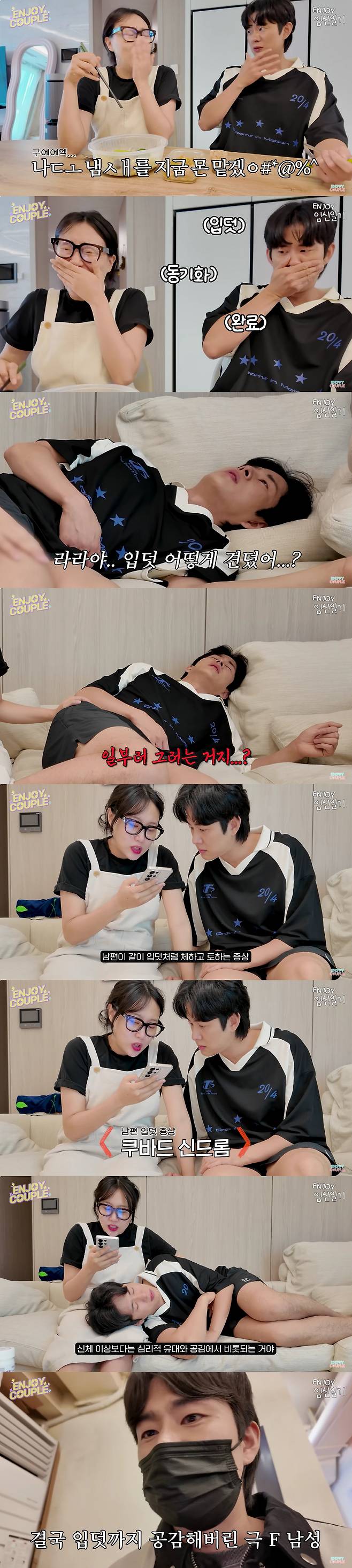 9일 유튜브 채널 '엔조이커플enjoycouple'에는 "비상사태 공감임신하고 입덧시작한 극 F남편! 쿠바드 증후군이요? 임신 8주차"라는 제목의 영상이 게재됐다.